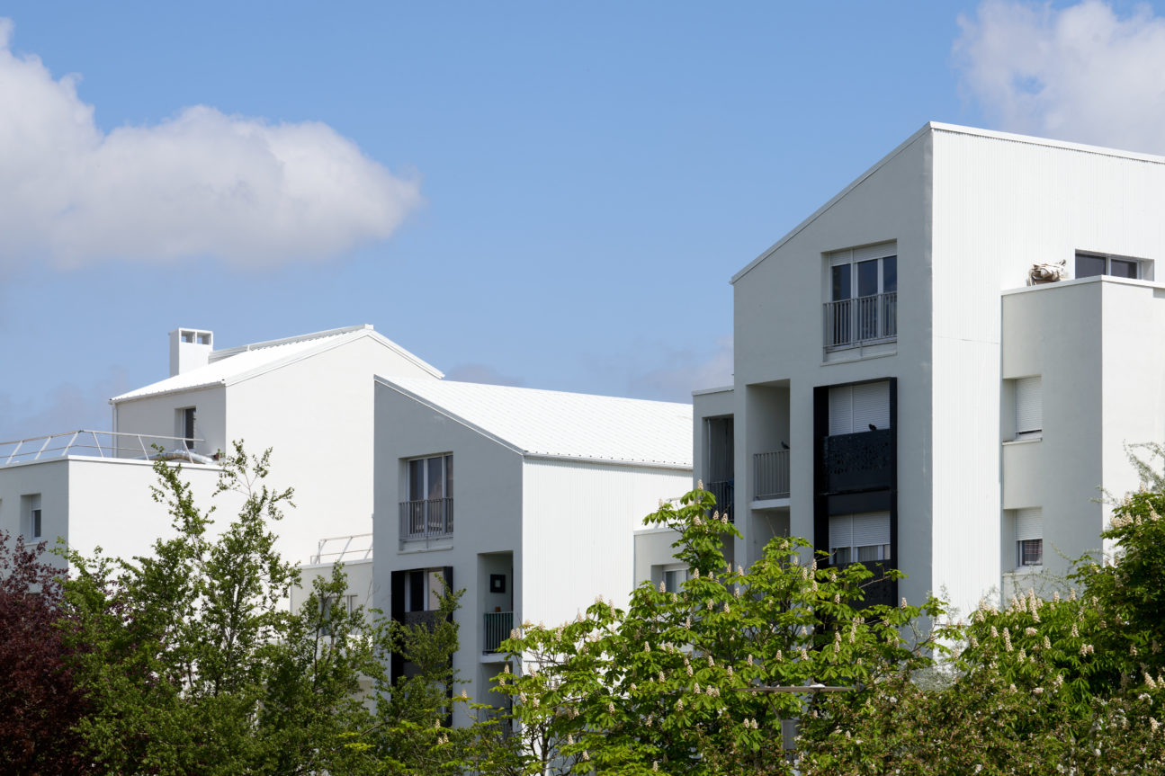 Le choix de la couleur est volontairement subtil pour ne pas stigmatiser la résidence: le bleu titane vient jouer comme une ombre et renforce les limites de la Résidence tout en mettant en valeur la couleur globale (ITE blanc) qui éclaire fortement l’intérieur de l’ilot.