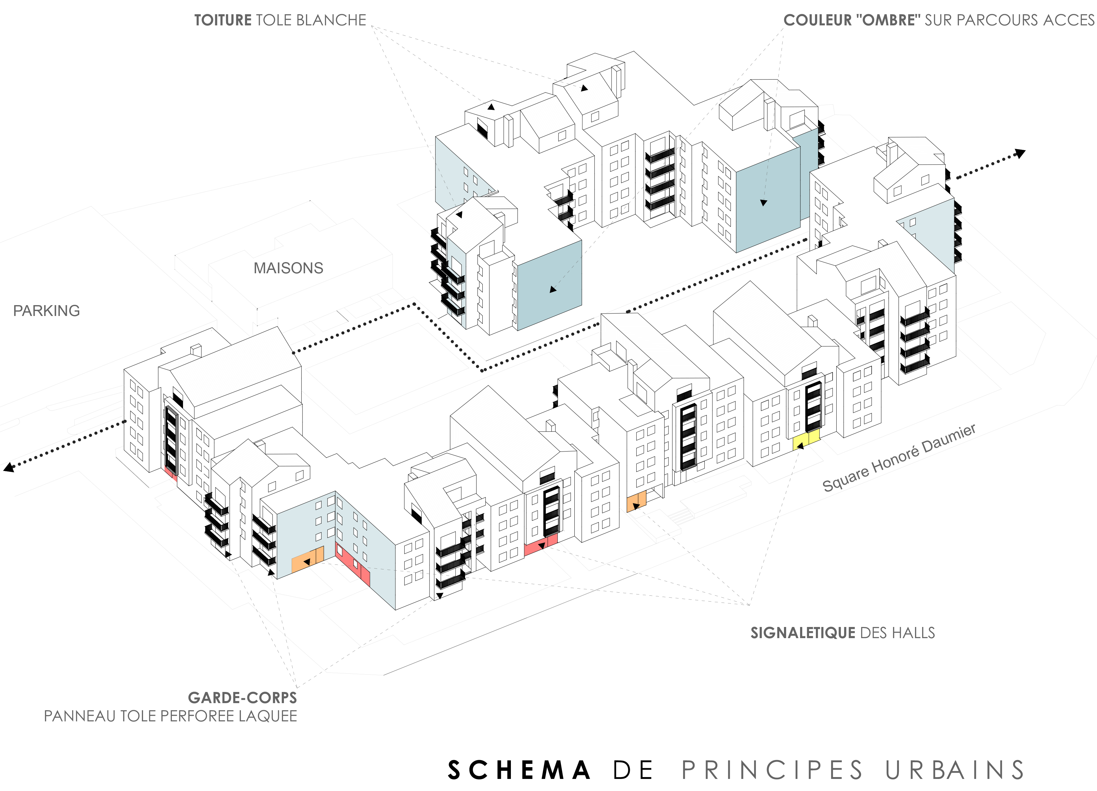 - Sur rue, les façades en retrait au Nord et au Sud de l’ilot reçoivent de la couleur pour mettre en valeur la volumétrie existante.