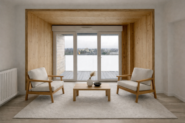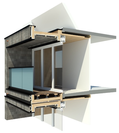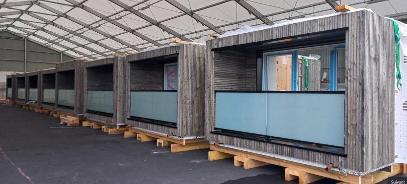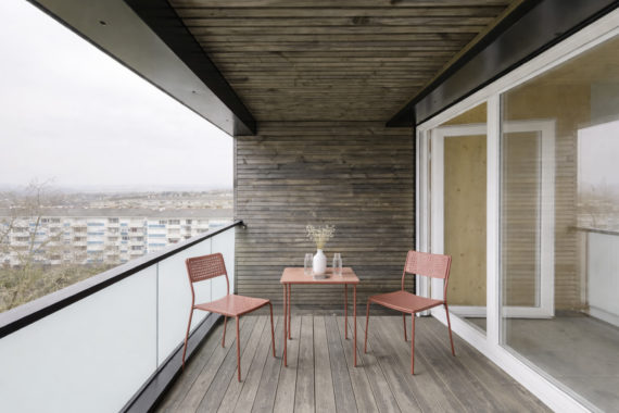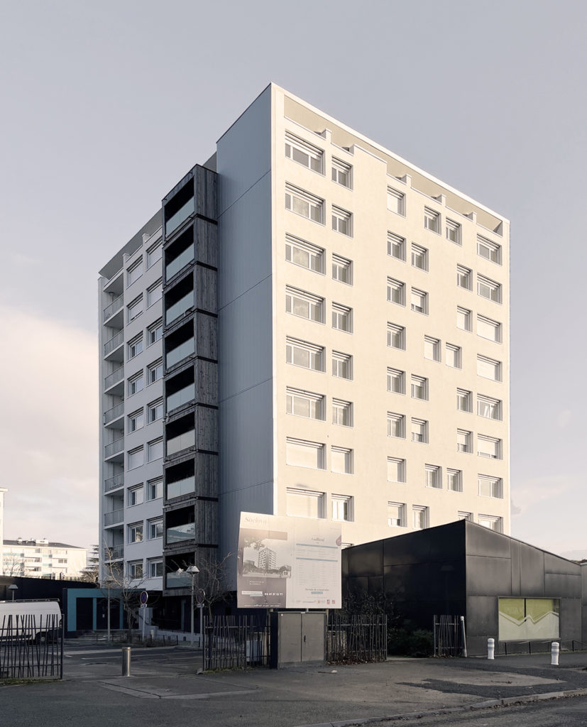 Pour répondre à la problématique de surchauffe en logement, le projet propose d’habiller les façades avec des brises soleil orientables métalliques. Sur les façades Est et Ouest nous retrouvons du bardage métallique jouant avec la lumière. Des modules bois préfabriqué 3D ont été annexé aux loggias existantes des salons des logements T4 afin d’agrandir la surface habitable des ces logements.